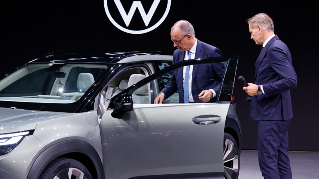 Almanya Başbakanı Friedrich Merz gets into a VW ID Cross'u inceliyor.(Fotoğraf: Alexandra BEIER / AFP)