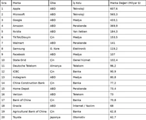 Söz konusu listede ABD şirketi Amazon yaklaşık 369,9 milyar dolarla 4’üncü, ABD şirketi Nvidia 184,3 milyar dolarla 5’inci, Çinli şirket Tiktok 153,5 milyar dolarla 6’ncı, ABD’li perakende şirketi Walmart 141 milyar dolarla 7’nci, Güney Koreli Samsung 119,2 milyar dolarla 8’inci, ABD’li Facebook 107 milyar dolarla 9’uncu, Çinli State Grid 102,4 milyar dolarla 10’uncu oldu.