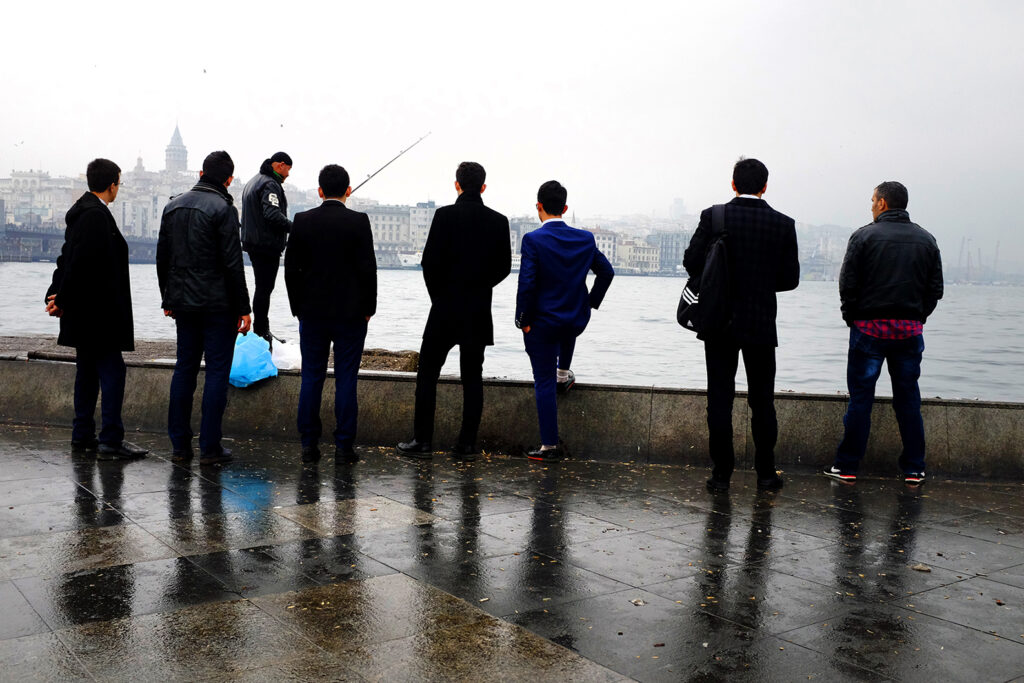 İstanbul’da yağmurlu günler bile sis ve yansımalarla çok fotojeniktir. Bir grup arkadaş, bir balıkçıyı izliyor, Türkiye, 2016. (Fotoğraf: Jerome De Perlinghi)