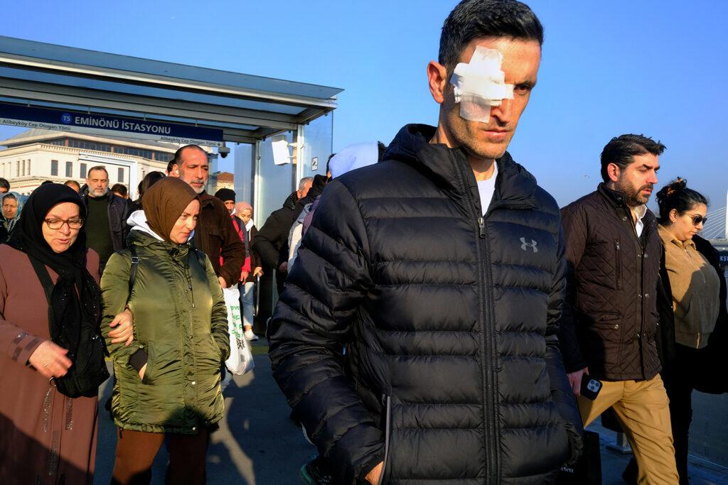 Yolcular tramvaydan yeni inmişler ve bu canlı yeni sabahta işlerine gitmek üzere yola çıkmışlar, İstanbul, Türkiye, Şubat 2024. (Fotoğraf: Jerome De Perlinghi)