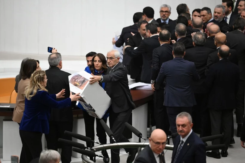 Vekillerin kürsü önünde kümelendiği, tabutun bir elden bir ele dolaştığı, “geçiş izni” tartışmasının ise saniyeler içinde fiziksel arbedeye evrildiği görüldü.