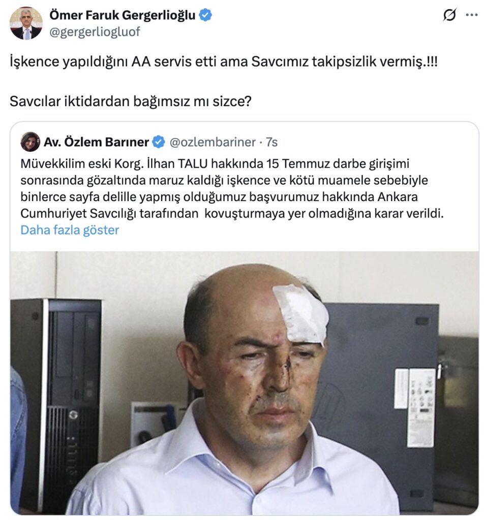 İlhan Talu’nun uğradığı işkence hakkında kovuşturmaya yer olmadığına karar verilmesine tepki gösteren DEM Parti Kocaeli Milletvekili Ömer Faruk Gergerlioğlu, “İşkence yapıldığını AA servis etti ama Savcımız takipsizlik vermiş.!!! Savcılar iktidardan bağımsız mı sizce?” ifadelerini kullandı.