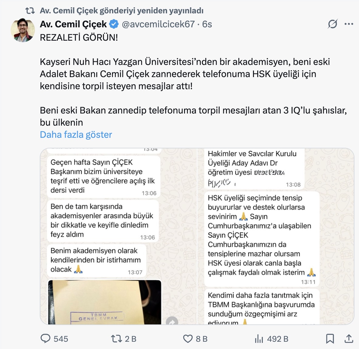 Ankara Barosu üyesi Avukat Cemil Çiçek, kendisine iletilen mesajları X hesabından paylaşarak rezalete tepki gösterdi. “Rezaleti görün” diyen Çiçek, şu ifadeleri kullandı: “Kayseri Nuh Hacı Yazgan Üniversitesi’nden bir akademisyen, beni eski Adalet Bakanı Cemil Çiçek zannederek telefonuma HSK üyeliği için kendisine torpil isteyen mesajlar attı! Beni eski Bakan zannedip telefonuma torpil mesajları atan 3 IQ’lu şahıslar, bu ülkenin üniversitelerinde öğrencilerimize ders anlatıyor! Ey Türk Milleti, bu rezaleti, bu kokuşmuşluğu, bu utanmazlığı gör!”