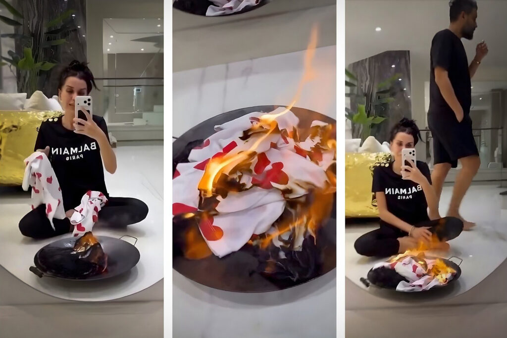 Sosyal medya hesabından paylaştığı videoda, Dilan Polat’ın salonun zeminine koyduğu bir tavanın içinde pijamalarını tutuşturduğu görüldü. Pijamaların kendisine ve ailesine uğursuzluk getirdiğini iddia eden ünlü fenomen, alevler yükselirken, “Çık hayatımızdan uğursuz, git” diyerek bağırdı.
