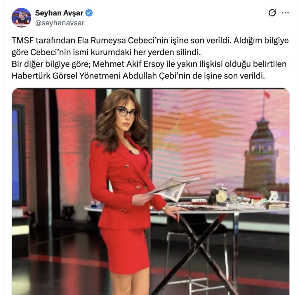 Gazeteci Seyhan Avşar’ın paylaşımına göre, Tasarruf Mevduatı Sigorta Fonu (TMSF) tarafından Habertürk spikerlerinden Ela Rumeysa Cebeci’nin görevine son verildi.