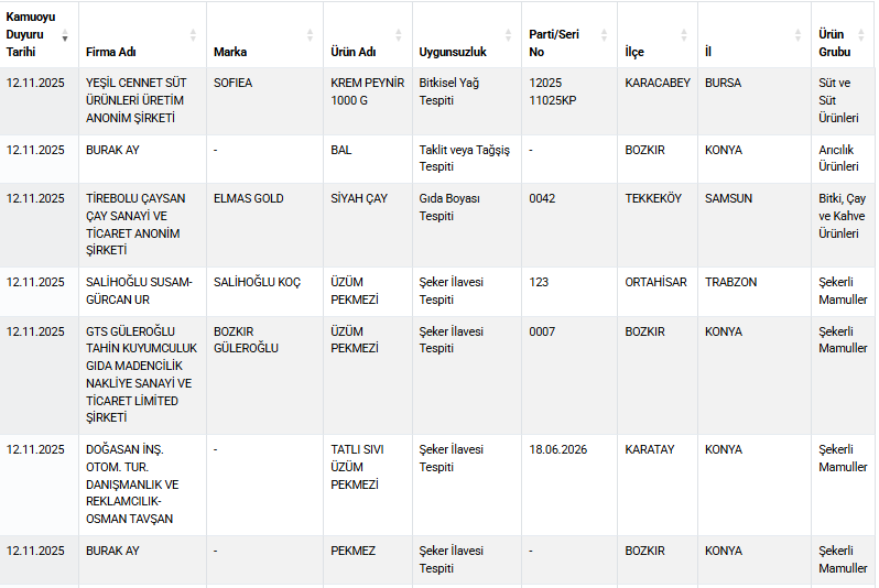 Listede pekmez, bal, siyah çay ve krem peynir gibi ürünler yer aldı. Son testlerde, bazı markaların ‘pekmez’ ibaresiyle sattığı üründe şeker olduğu, balda taklit veya tağşiş bulunduğu belirlendi.