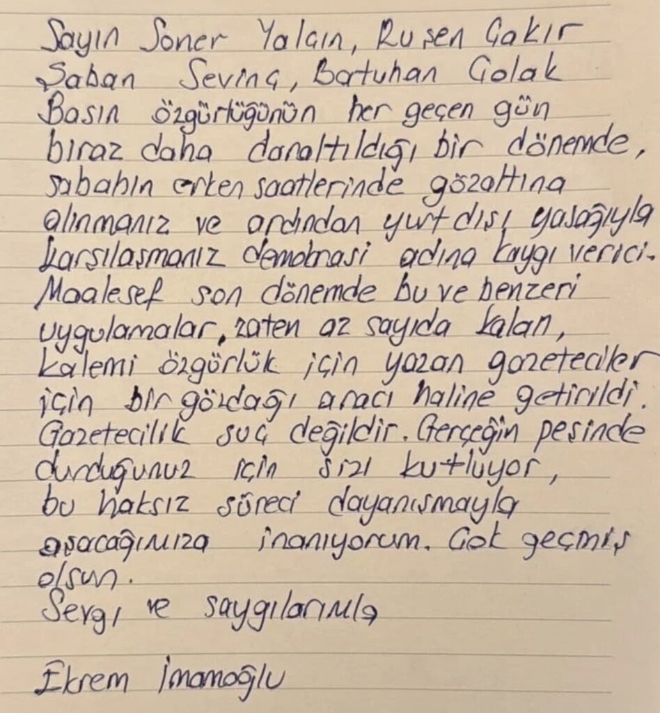 CHP’nin Cumhurbaşkanı adayı ve İBB Başkanı Ekrem İmamoğlu, ifadeye götürülen gazetecilere mektup gönderdi.