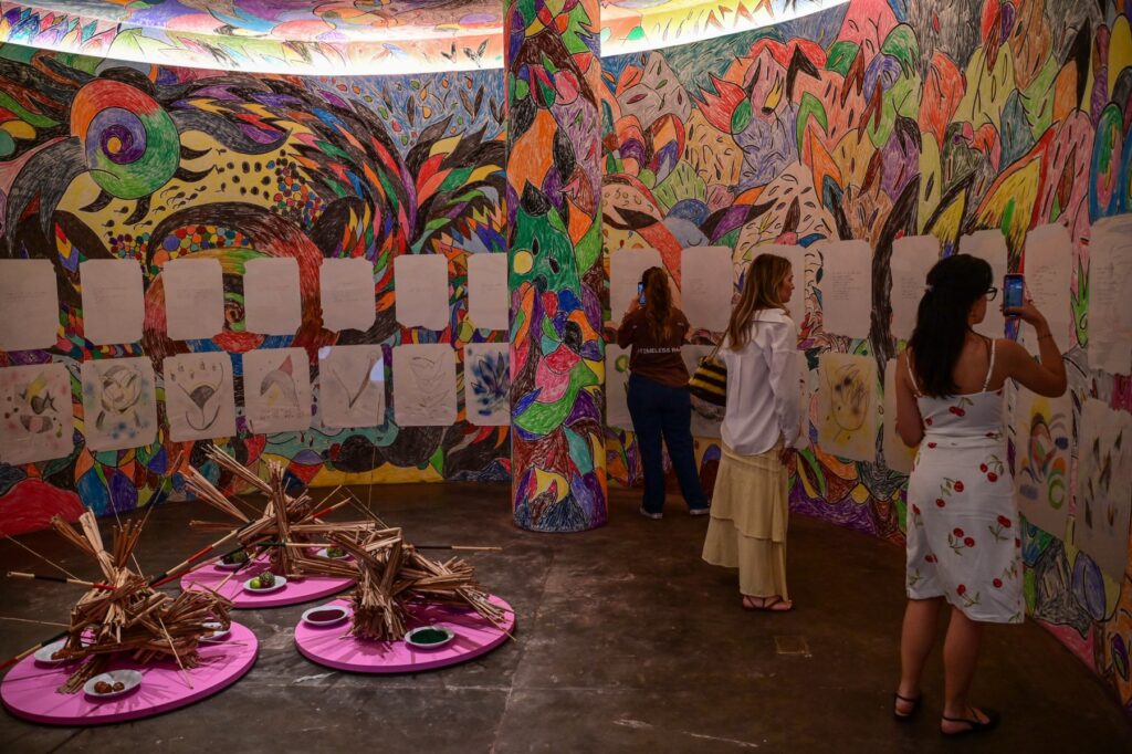 Ziyaretçiler, Sao Paulo'daki 35. Bienal'de sergilenen Brezilyalı sanatçı Tadaskia'nın eserini izliyor. (2023)(Fotoğraf: Nelson ALMEIDA / AFP)