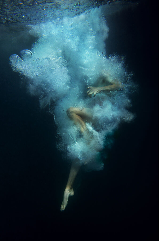 Autio’nun en sık başvurduğu yöntemlerden biri, konularını yukarıdan — çoğu zaman oldukça yüksek bir noktadan — fotoğraflamaktır. Bu bakış açısı, izleyici ile konu arasında belirli bir mesafe yaratır; insanlar kimliklerinden ziyade hareket hâlindeki bedenlere dönüşür. Yüzler çoğu zaman seçilemez. Bunun yerine odakta, suyla mücadele eden ya da ona teslim olan bedenlerin duruşları, savrulan kolları ve bacakları yer alır.