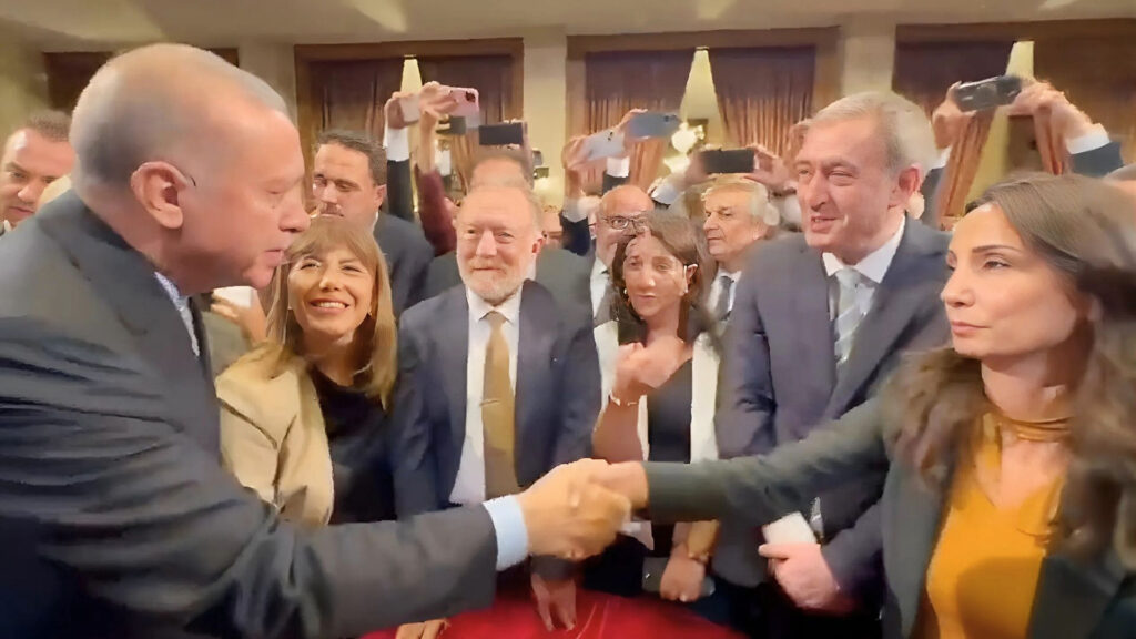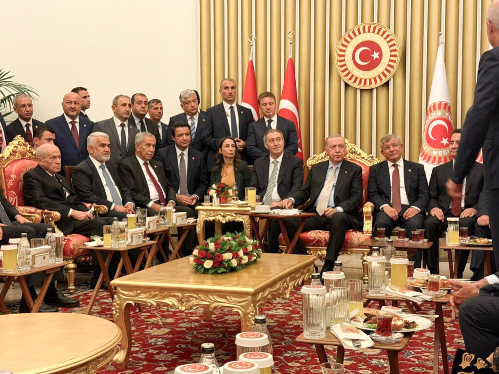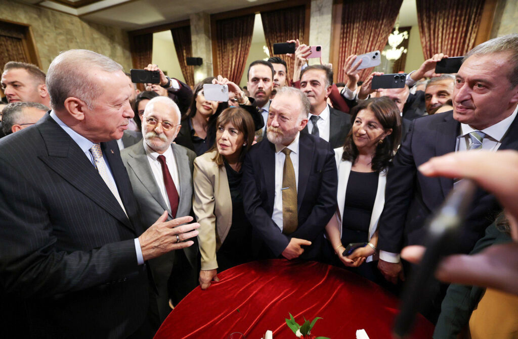 Hatimoğulları’nın bu açıklamasından dakikalar sonra resepsiyona katılan Cumhurbaşkanı Recep Tayyip Erdoğan, TBMM Başkanı Numan Kurtulmuş ve beraberindeki heyetle DEM Parti masasına geldi. Cumhurbaşkanı Erdoğan, DEM Parti Milletvekilleriyle tokalaştı. DEM Parti Eş Genel Başkanları Tuncer Bakırhan ve Tülay Hatimoğlulları ile de tokalaşan Cumhurbaşkanı Erdoğan, yaşanan olayla ilgili “Kusura bakmayın” dedi. DEM Parti Milletvekili Sezai Temelli’ye, gün içinde “Söyledin mi?” diye soran Erdoğan, Temelli’den “Evet söyledim” yanıtını aldı.