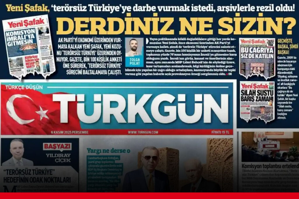 Türkgün, “Derdiniz ne sizin?” başlıklı sürmanşette “Yeni Şafak Terörsüz Türkiye’ye darbe vurmak istedi, arşivlerle rezil oldu” denildi.