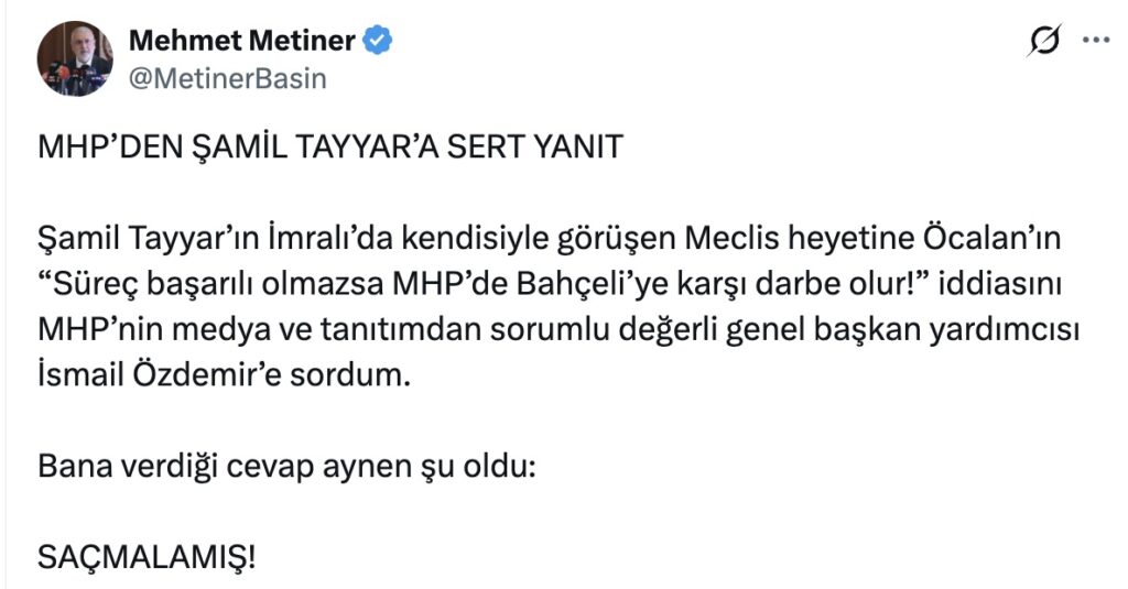 “Şamil Tayyar’ın İmralı’da kendisiyle görüşen Meclis heyetine Öcalan’ın “Süreç başarılı olmazsa MHP’de Bahçeli’ye karşı darbe olur!” iddiasını MHP’nin medya ve tanıtımdan sorumlu değerli genel başkan yardımcısı İsmail Özdemir’e sordum.” ifadelerini kullanan Metiner, “Bana verdiği cevap aynen şu oldu: Saçmalamış!” sözlerini sarf etti.