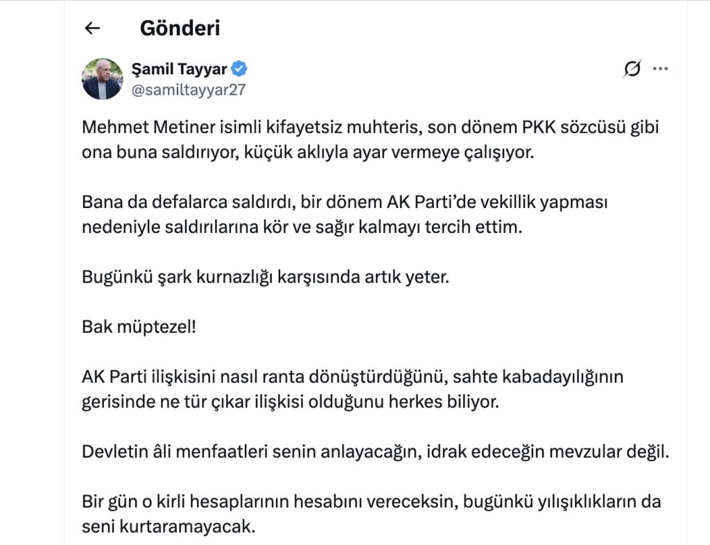 Şamil Tayyar ise, Metiner’in sözlerine sert bir karşılık vererek “Mehmet Metiner isimli kifayetsiz muhteris, son dönem PKK sözcüsü gibi ona buna saldırıyor, küçük aklıyla ayar vermeye çalışıyor. Bana da defalarca saldırdı, bir dönem AK Parti’de vekillik yapması nedeniyle saldırılarına kör ve sağır kalmayı tercih ettim. Bugünkü şark kurnazlığı karşısında artık yeter.” ifadelerini kullandı