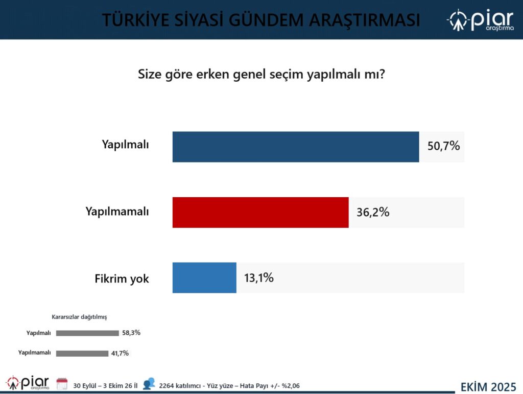 PİAR Araştırma’nın Ekim 2025 tarihli “Türkiye Siyasi Gündem Araştırması”na göre seçmenlerin yüzde 50,7’si erken genel seçim yapılması gerektiğini düşünüyor. “Erken seçim yapılmamalı” diyenlerin oranı yüzde 36,2’de kalırken, yüzde 13,1’lik kesim ise “fikrim yok” yanıtını verdi.