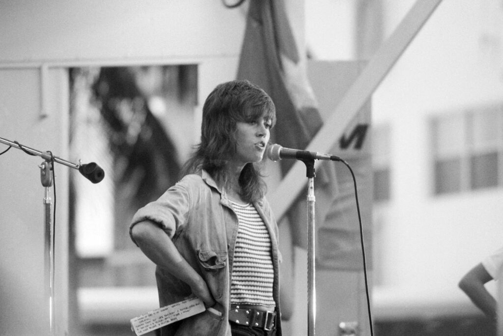 ABD’li aktris ve savaş karşıtı aktivist Jane Fonda, 21 Ağustos 1972’de Miami’de Vietnam Savaşı’nı protesto etmek için Kongre Salonu önünde düzenlenen gösteride kadınlara ve Vietnam gazilerine sesleniyor. (Fotoğraf: ARNOLD SACHS / AFP)