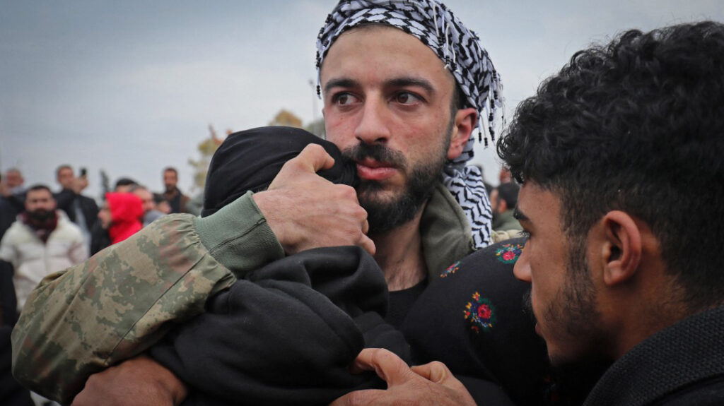 Kürt aileler, ateşkesin ardından kuzeydeki Halep kentinden otobüslerle Kürt kontrolündeki kuzeydoğu kenti Kamışlı’ya getirilen Kürt savaşçıları karşılıyor, (Fotoğraf: Delil SOULEIMAN / AFP)